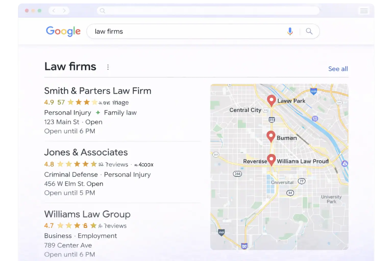 Web design firms enhance local visibility with integrated maps, reviews, and schema for dominant map pack performance. Website design for lawyers includes city-specific landing pages, embedded Google Maps, and LocalBusiness/Review markup.