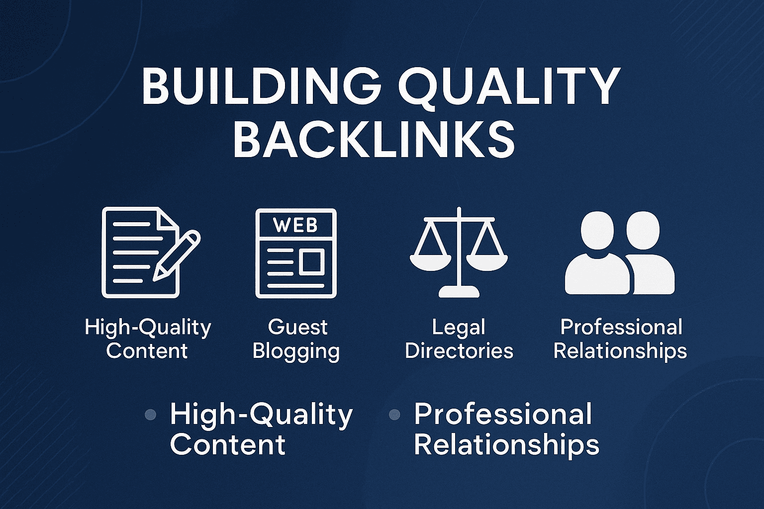 Building quality backlinks is crucial for lawyer SEO. Focus on high-quality content, guest blogging, legal directories, and professional relationships while avoiding low-quality links and buying schemes.